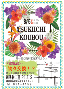 『毎月してみたらどうだろう』という声もあがり、記録的な猛暑の中 8月にTSUKIICHIKOUBOUと名称を変えて開催しました。『わらしべ』という物々交換も一緒にしました。っが、とにかく暑かった・・・・汗 ご来店頂いた方、誠にありがとうございました。出店者の皆様、暑い中本当におつかれさまでしたm(__)m わらしべはご好評頂き、またして欲しいと嬉しい声も頂きましたので、いつか開催を致します。ただ、月に1度と言いいましたが、暑い夏と寒い冬は控えさせて頂く事にしました(-_-;)