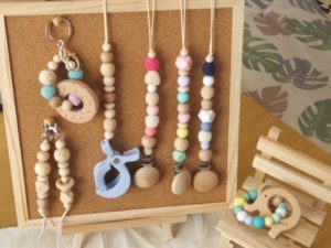 食品衛生法に適合したシリコンビーズや天然木をつかったキーホルダー、